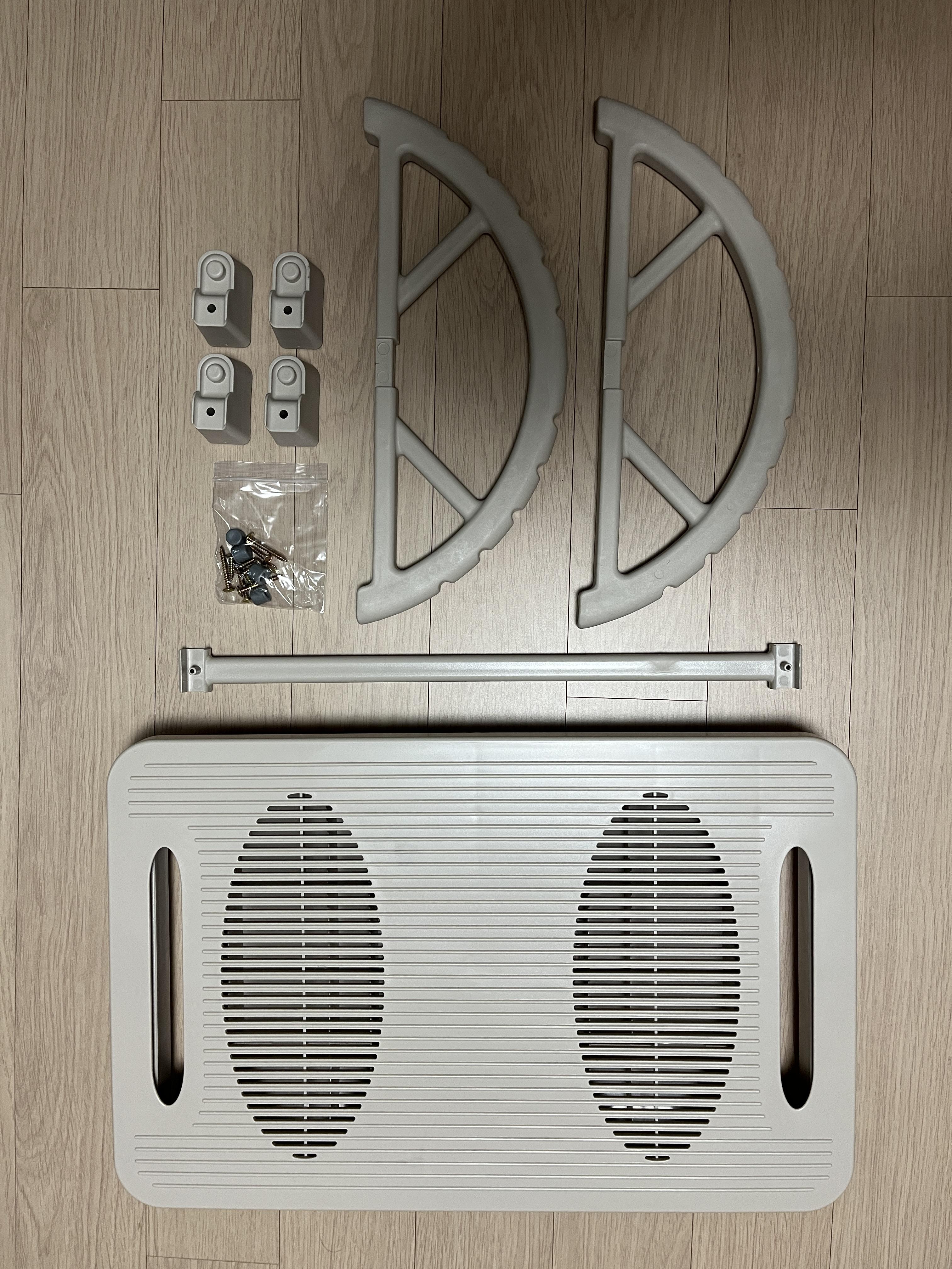 가로로 된 지지대를 홈에 맞게 끼워주시고(여기는 나사가 필요없어요) 그 위에 아까 조립한 발판을 끼워주시면 완성!